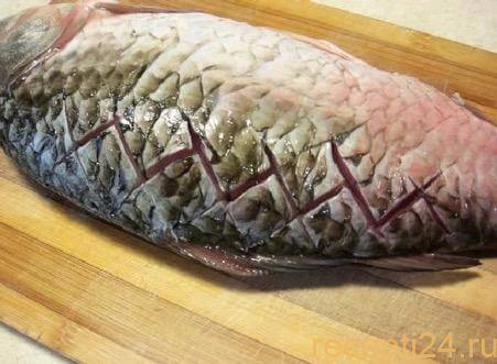 В области спинки делаем косые надрезы, чтобы самая толстая часть тушки хорошо пропеклась. Натираем смесью 1 чайной ложки соли и 0,5 чайной ложки черного молотого перца рыбу и оставляем на 20 минут.