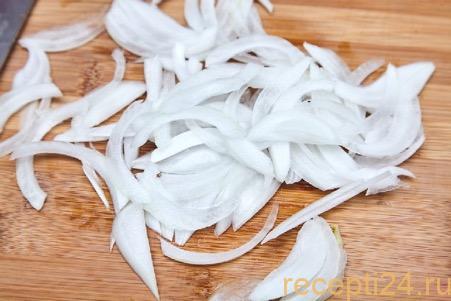 Лук нужно почистить и нарезать полукольцами, сложить в глубокую тарелку или чашку. Заливаем его 1 столовой ложкой лимонного сока, оставляем мариноваться на 15 минут.