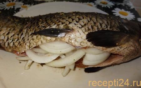 Как только лук и рыба промаринуются, соединяем их вместе. Полукольцами наполняем тушку изнутри.