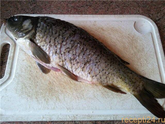 Карпа необходимо хорошенько очистить от чешуи, выпотрошить, удалить и отрезать все ненужное. Тщательно ополоснув рыбу под холодной проточной водой, просушиваем ее с помощью бумажного полотенца. Щедро натираем смесью соли и перцев. Оставляем промариноваться на 1 час.