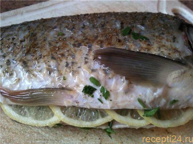 Противень с рыбой отправляем в разогретую до 200º С духовку, оставляем запекаться на 40 минут.