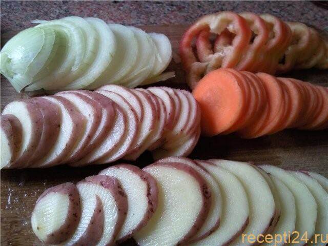 Помытые и очищенные овощи необходимо нарезать тонкими ломтиками или соломкой.