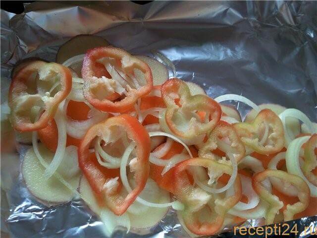 Противень, заранее смазанный подсолнечным маслом, застилаем фольгой, на которую необходимо выложить подушку из овощей. Для этого берем половину всех ингредиентов: первый слой ― картофель, затем морковь, кольца лука, болгарский перец.