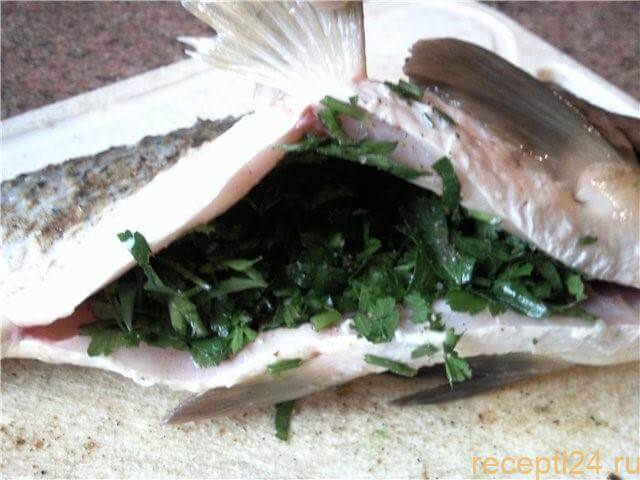 Пучок зелени (петрушку или укроп ― кому что по душе) хорошенько моем, мелко шинкуем и смешиваем с остатками смеси для натирания (приправы, соль). Фаршируем рыбу полученной смесью.