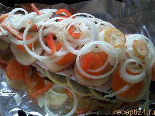 Второй половиной нарезанных овощей укрываем карпа в такой же последовательности: сначала картошка, далее морковь, сверху ― лук, сладкий перец.