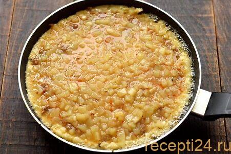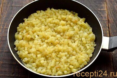 Сначала нужно подготовить картофель. Клубни очищают и мелко крошат. Не стоит использовать терку, так как может измениться консистенция блюда. На сковороде нужно разогреть масло, и туда поместить овощ. Жарить нужно пока картофель не станет мягким. При этом он не должен зажариться, а просто слегка потушиться.