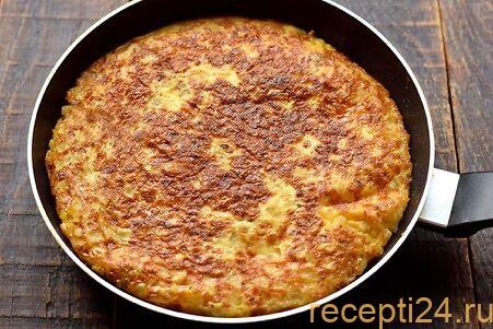 Готовить блюдо нужно под крышкой на маленьком огне. Через 7 минут пирог нужно перевернуть и обжаривать другую сторону в течение 7 минут. Румяная корочка — признак того, что пирог готов.