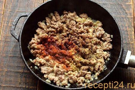 Также можно использовать томатную пасту или соус во время жарки фарша. Он добавит начинке легкой кислинки. Важно добавить его в самом начале обработки. Тогда мясо напитается вкусом, а лишняя жидкость успеет испариться.