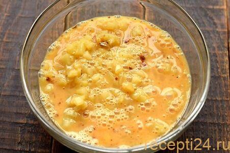В глубокую тарелку нужно влить яйца, добавить приправы и тщательно перемешать. Заливку добавляют к картофелю и перемешивают.