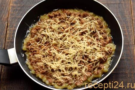 Глубокую сковороду нужно тщательно смазать маслом и разогреть. На дно выкладывают половину картофеля и посыпают сыром.