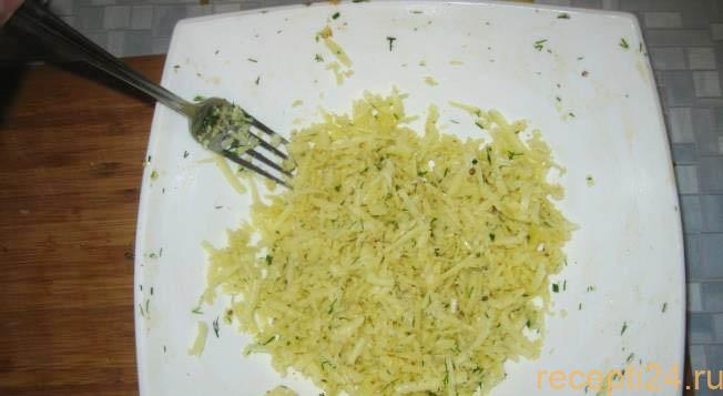 На крупной терке натереть 100 г сыра и смешать его с оставшейся 1 ст.л. маринада.