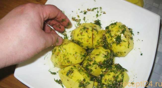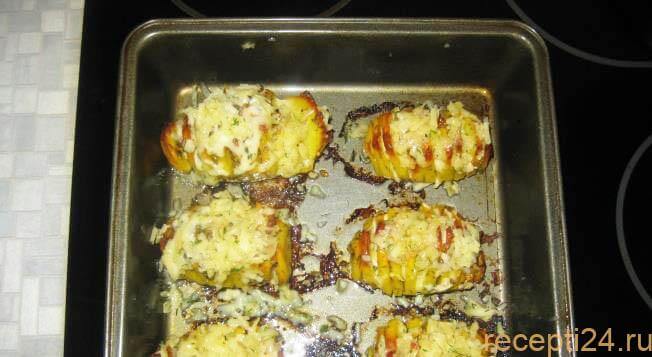Если картофель готов, пересыпать его сыром, смешанным с маринадом. Делать это нужно аккуратно. Сыр должен попасть во все надрезы.