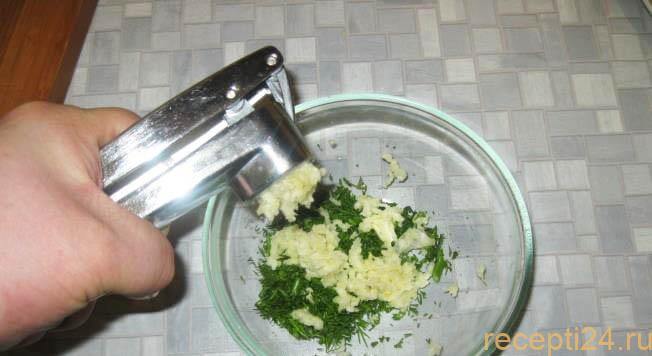 Добавить к зелени пропущенные через чеснокодавку 3 зубчика чеснока.