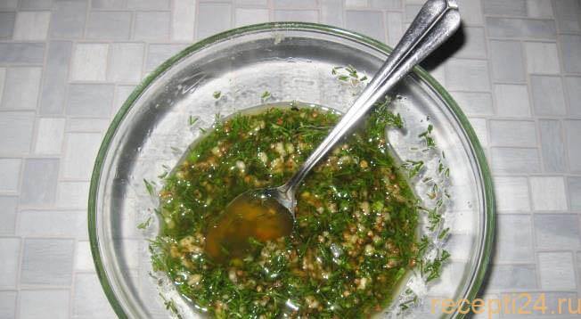 Хорошо промазать внутренние части надрезов, стараясь максимально оставить там частички зелени и чеснока.