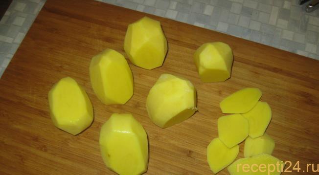 Почистить 6 картошек. На каждой с одной стороны сделать срез, чтобы картофелина могла стоять на нем устойчиво.