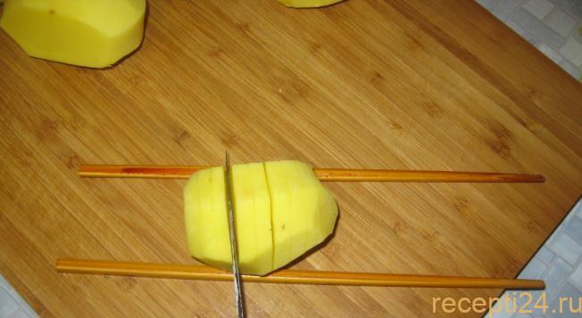 Надрезать клубни с шагом по 0,3-0,5 см. Надрезы глубокие, но не разрезающие картофель полностью. Удобно использовать своеобразные ограничители из китайских палочек, расположенных по бокам клубня.