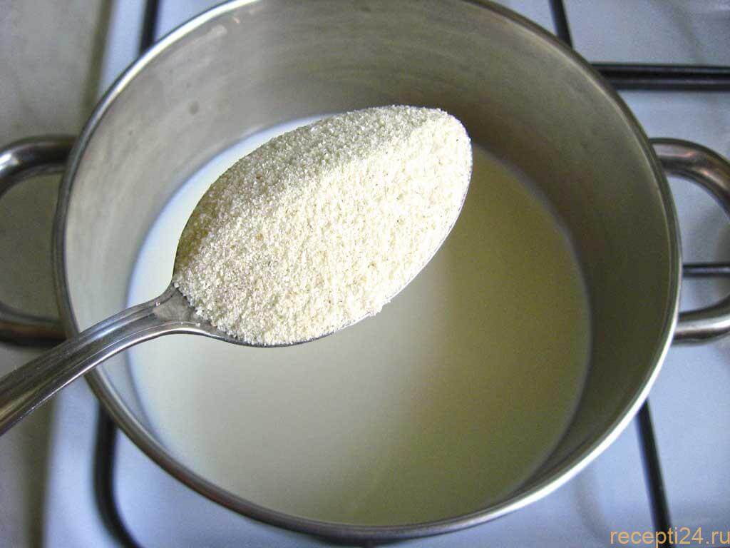 Постепенно добавляйте в кастрюлю манную крупу. Не забывайте помешивать, чтобы не образовались комочки.