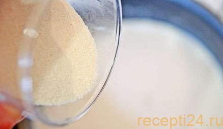 Когда топленое молоко полностью готово, под кастрюлей увеличивают немного огонь и начинают всыпать манную крупу. Делать нужно это осторожно, постоянно помешивая, чтобы избежать образования комков.