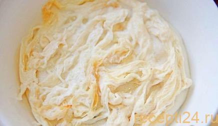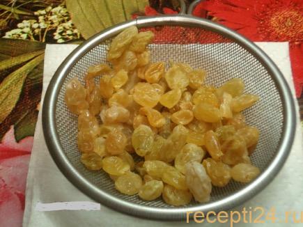 Изюм помещается в небольшую мисочку и заливается кипятком на 10 мин. Вода сливается, изюм выкладывается на сито или салфетку, чтобы просохнуть.