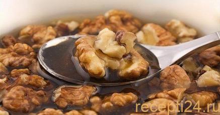 Орехи очищаются от кожуры и провариваются вместе с подготовленным изюмом 5 мин на водяной бане. Рекомендуется перед варкой орехи немного поджарить на сковороде. Они приобретут более насыщенный вкус и аромат. К грецким орехам можно добавить другие сорта.