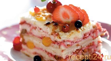 В высокую посуду выкладывается на дно часть пенки. На нее сверху накладывается слой манной каши. Поверх нее выкладывают часть орехов и изюма. Дальше – опять идет пенка, манная каша и фруктовый слой. Так повторяют несколько раз.