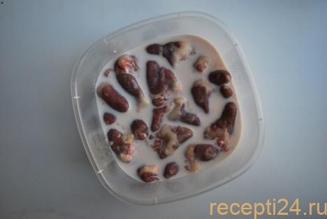 Куриные сердечки промыть водой и обсушить бумажным полотенцем. Острым ножом аккуратно вырезать сосуды, по желанию – жир с верхней части субпродуктов. Поместить в глубокую посуду и залить молоком. Оставить на 1-2 часа при комнатной температуре или закрыть крышкой и убрать в холодильник на ночь.