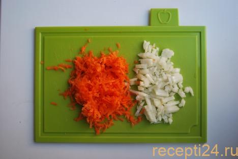 Очистить лук и морковь, вымыть. Нарезать лук маленькими кусочками или натереть на крупной терке. Так появится больше сока, и готовое блюдо будет сочнее. Морковь натереть на терке. Если любите пикантные нотки, можете выдавить 1-2 зубчика чеснока и перемешать с луком.