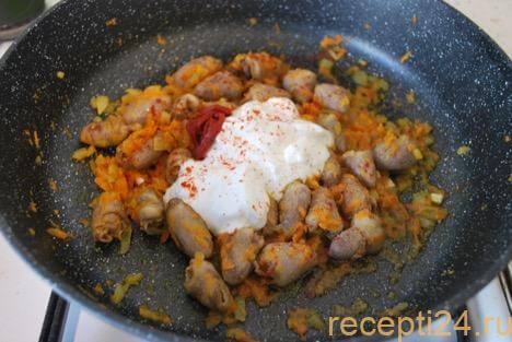 По рецепту приготовления куриных сердечек в сметанном соусе можете сделать и другие субпродукты, например, куриные желудки (пупки). Предварительно отварите их в небольшом количестве воды в течение 1 часа.