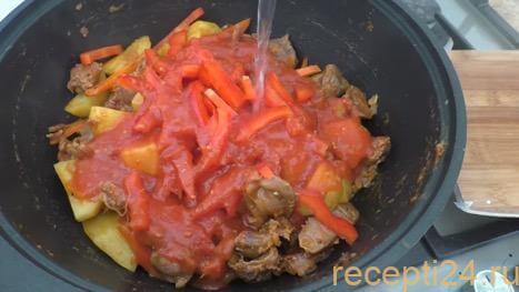 Если вместо томатного сока используется томатная паста, нужно вливать для тушения большее количество воды. Ориентир такой: жидкость примерно на палец должна возвышаться над мясом с овощами.