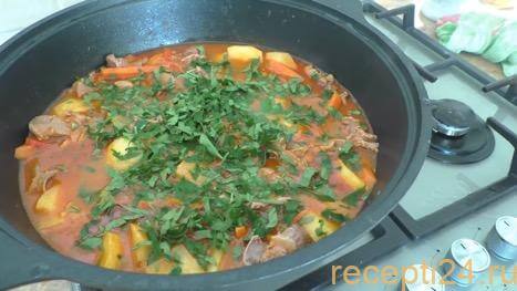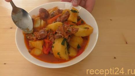 Один сладкий перец нарезать примерно такими же кусочками, как и морковь, добавить в блюдо, залить 1,5 ст. томатного сока и 1 ст. воды. Довести соль по вкусу, накрыть желудочки со специями и овощами крышкой и тушить на медленном огне еще примерно 5-7 минут. За 2 минуты до окончания этого времени, добавить в блюдо порубленную петрушку.