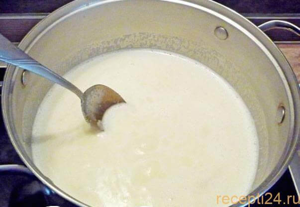 Простое коровье молоко добавьте в кастрюлю, поставьте на плиту и варите до закипания.
