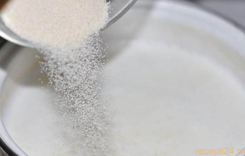 Постепенно добавляйте манную крупу, не забывая помешивать.