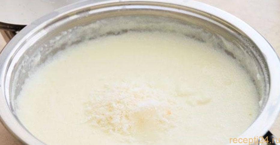 Тонкой струйкой высыпаем манную кашу в молоко. При этом необходимо постоянно помешивать, что важно. Только в таком случае можно избежать комочков.