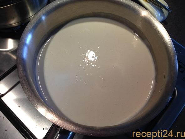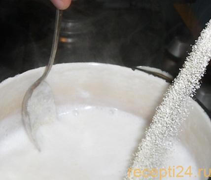 Молоко добавляем в кастрюлю и ставим на небольшой огонь. Всыпаем соль и сахар. Теперь осталось дождаться, когда молоко закипит, чтобы перейти к следующему шагу.