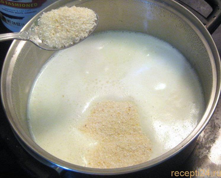 Постоянно помешивая, добавляйте небольшими порциями манную крупу. Не стоит сразу же засыпать все. Это может стать причиной образования комочков, которые нравятся не всем.