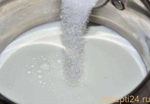 В небольшую кастрюлю добавьте молоко и сахар, поставьте на огонь и доведите до кипения.