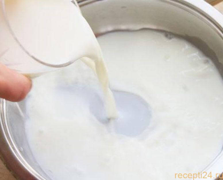 Добавляем молоко, воду, соль, сахар и манную крупу в кастрюлю. Все тщательно перемешиваем и ставим на огонь.