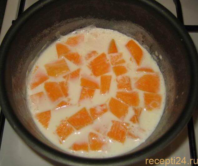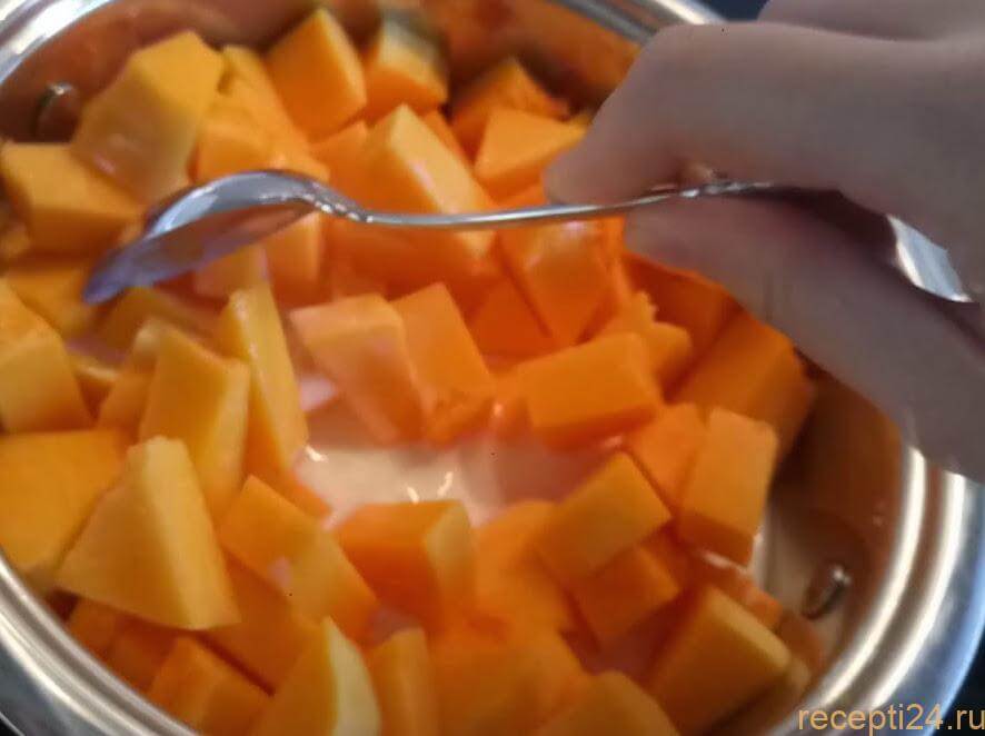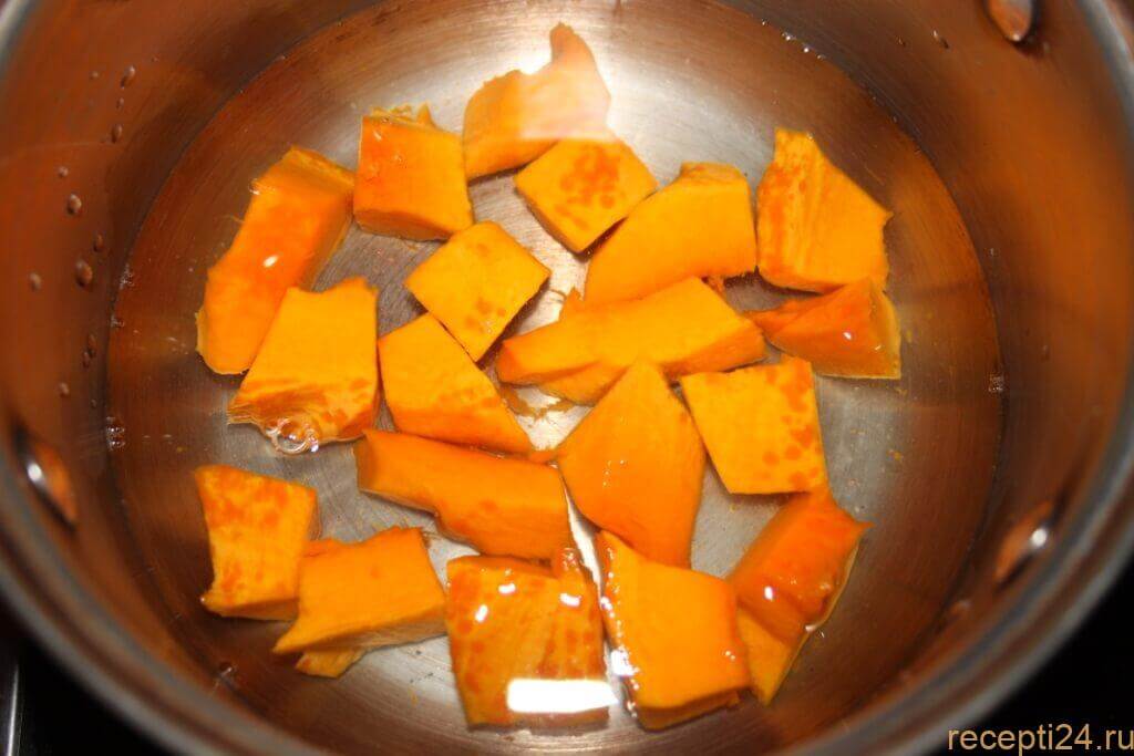 Тыкву сначала следует помыть, почистить, удалить все семена и порезать небольшими кубиками. После этого ее следует положить в кастрюлю. Заливаем водой, ставим на огонь. Ждем, когда закипит вода и варим тыкву на протяжении 10 минут.