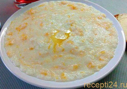 В кастрюлю с тыквой самое время добавить манную крупу. Стоит делать это медленно и не забывать постоянно помешивать. Варим приблизительно 6-7 минут. После этого выключаем огонь.