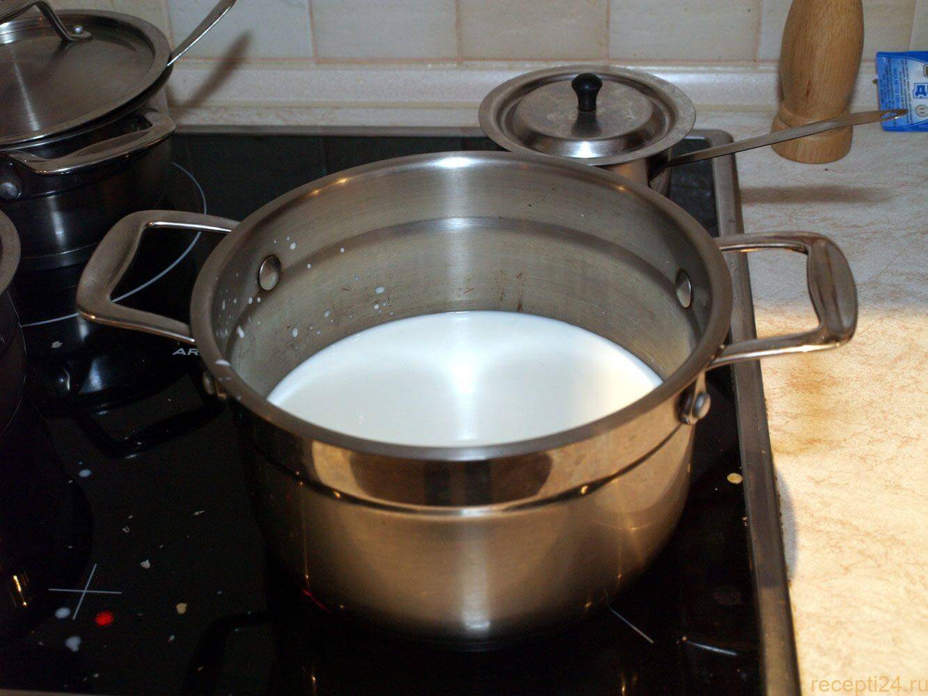В кастрюлю наливаем воду и молоко и доводим до кипения.