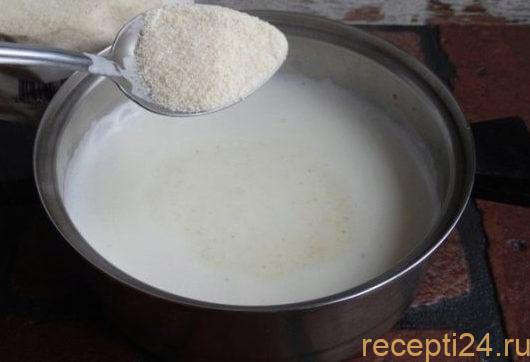Добавляем сахар и помешиваем. Небольшими порциями засыпаем манную крупу. Варим в течение 3 минут, постоянно помешивая.
