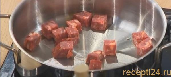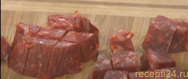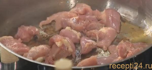 Достать обжаренную колбасу. Отправить на сковороду с растопленным жиром 0,5 кг очищенных от кожи и нарезанных средними кусочками куриных бедер. Жарить на среднем огне 4 мин.