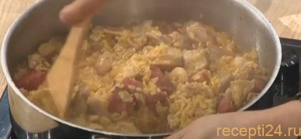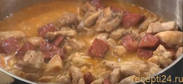 По истечении 10 мин. добавить еще 1 ст. бульона, и выложить сверху в сковороду обжаренную курицу и чоризо. Не перемешивать! Увеличить огонь и варить еще 20 мин.