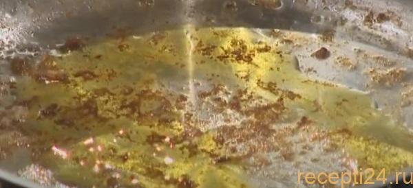 Достать обжаренные кусочки курицы из сковороды и дать вытопленному соку с жиром немного карамелизироваться в течение 1-2 минут. После этого добавить 2 ст.л. оливкового масла.