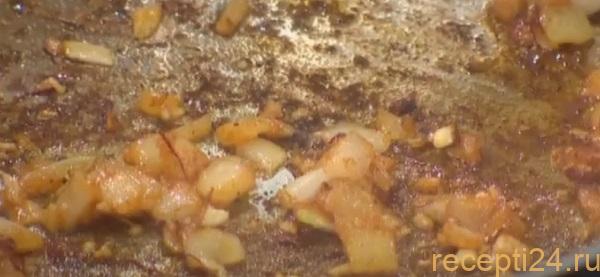 Почистить 1 головку лука и пропустить через мясорубку. Мелко нарубить 3 зубчика чеснока. Обжаривать на сковороде в течение 2 мин. до образования золотистого цвета.