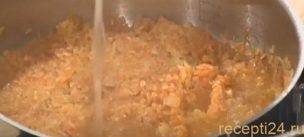 Высыпать на сковороду к овощам 1 ст. промытого риса и разровнять его. Добавить 1 ст. куриного бульона. Он должен покрывать рис на 1 см. Перемешивать нельзя! Варить без крышки примерно 10 мин.