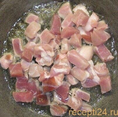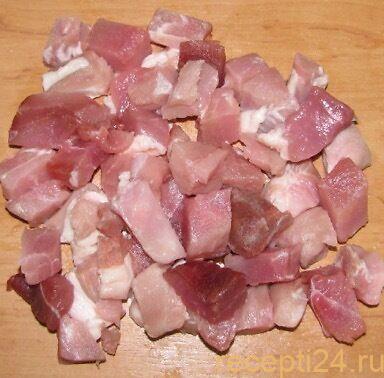 Свинину нарезают на мелкие кусочки.