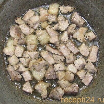 Жарить мясо нужно 5-7 минут до появления корочки. Необходимо постоянно помешивать кусочки, чтоб все равномерно прожарилось.