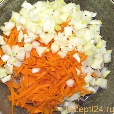 Лук режут на мелкие кусочки. Морковь натирают на крупной терке.