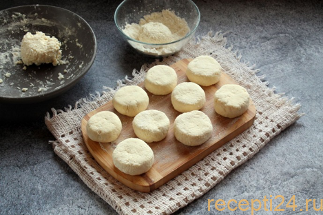 После этого формируем сырники. Это можно сделать разными способами. Самый простой из них это просто скатать шарики руками и придавить их, чтобы сформировать плоский круг.